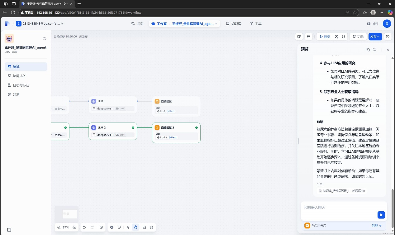 完成基于糖尿病与高血压两个不同慢性病知识库的基于chatflow的AI应用。